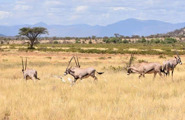 Nach intensiven Tagen voller Begegnungen führt Sie die Reise weiterin das Samburu-Nationalreservat. Schon der Flug ist ein Erlebnis, wenn sich die Landschaft vor Ihren Augen verändert. Samburu gilt als eine Perle abseits der bekannten Wege. Hier wartet eine ganz besondere Tierwelt auf Sie. Samburu ist die Heimat der „Special Five“: der langhalsigen Gerenuk-Antilope, des fein gestreiften Grevy-Zebras, der eleganten Netzgiraffe, des stolzen Beisa-Oryx und des exotisch anmutenden Somali-Straußes mit seinen blauen Beinen. Doch Samburu bietet weit mehr. Während einer Pirschfahrt entdecken Sie vielleicht Elefantenherden, die durch das sandige Flussbett ziehen, beobachten Löwen, die in der Nachmittagssonne durch das hohe Gras schleichen, oder erleben Geparden, die im Team jagen und ihre Beute teilen. Mit etwas Glück offenbart sich sogar ein Leopard, der lautlos durch das Dickicht gleitet – ein Moment, der den Atem raubt.