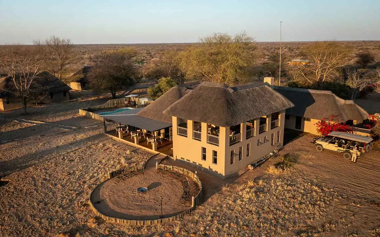 Das Camp bietet 8 Chalets mit eigenem Bad, jedes mit einer privaten Veranda mit Blick auf die Kalahari-Oase, einen Hauptbereich mit Bar, Essbereich und einer Aussichtslounge mit Blick auf ein Tal sowie einen Swimmingpool. Das Wasserloch ist eine der Hauptattraktionen und man kann Stunden damit verbringen, im Hauptbereich zu sitzen und die Aussicht und die Aktivitäten zu genießen, wenn die Wildtiere zum Trinken kommen.